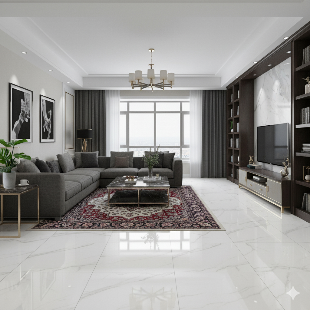 Imagine a living room with large, marble vein white porcelain tiles. On top sits a grey sofa with soft cushions, a marble top with gold trimmings coffee table, and a textured rug. Adding bold art pieces on the wall, and a touch of greenery from plants adds life.