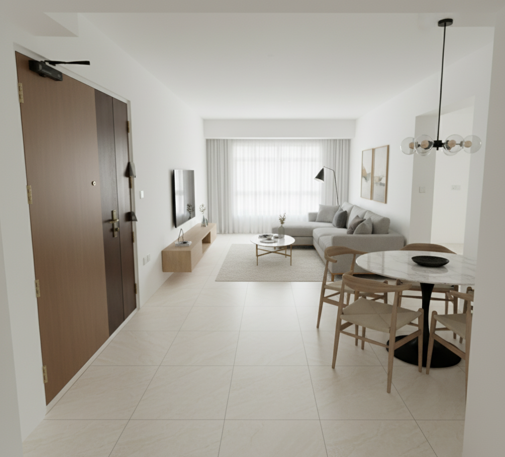 • Accent Colours Pop – A bold armchair, vibrant cushions, or a statement artwork stands out more against neutral tiles.